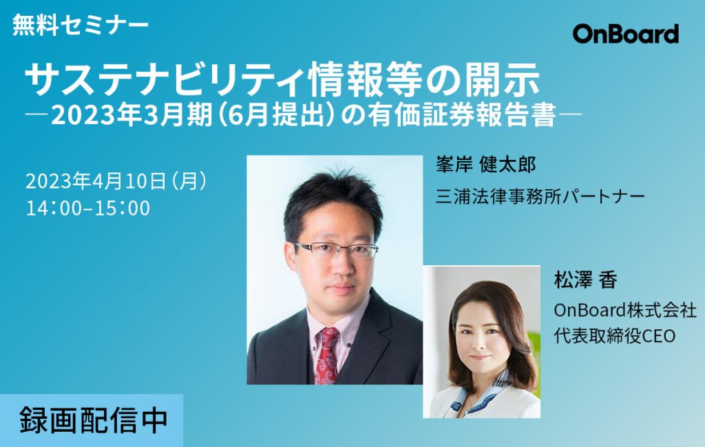 2023年4月10日(月)に講師:峯岸 健太郎氏をお迎えして、無料セミナー「サステナビリティ情報等の開示ー2023年3月期(6月提出)の有価証券報告書ー」をオンラインにて開催いたしました。録画視聴を含め、110名ほどの方にご参加いただきました。