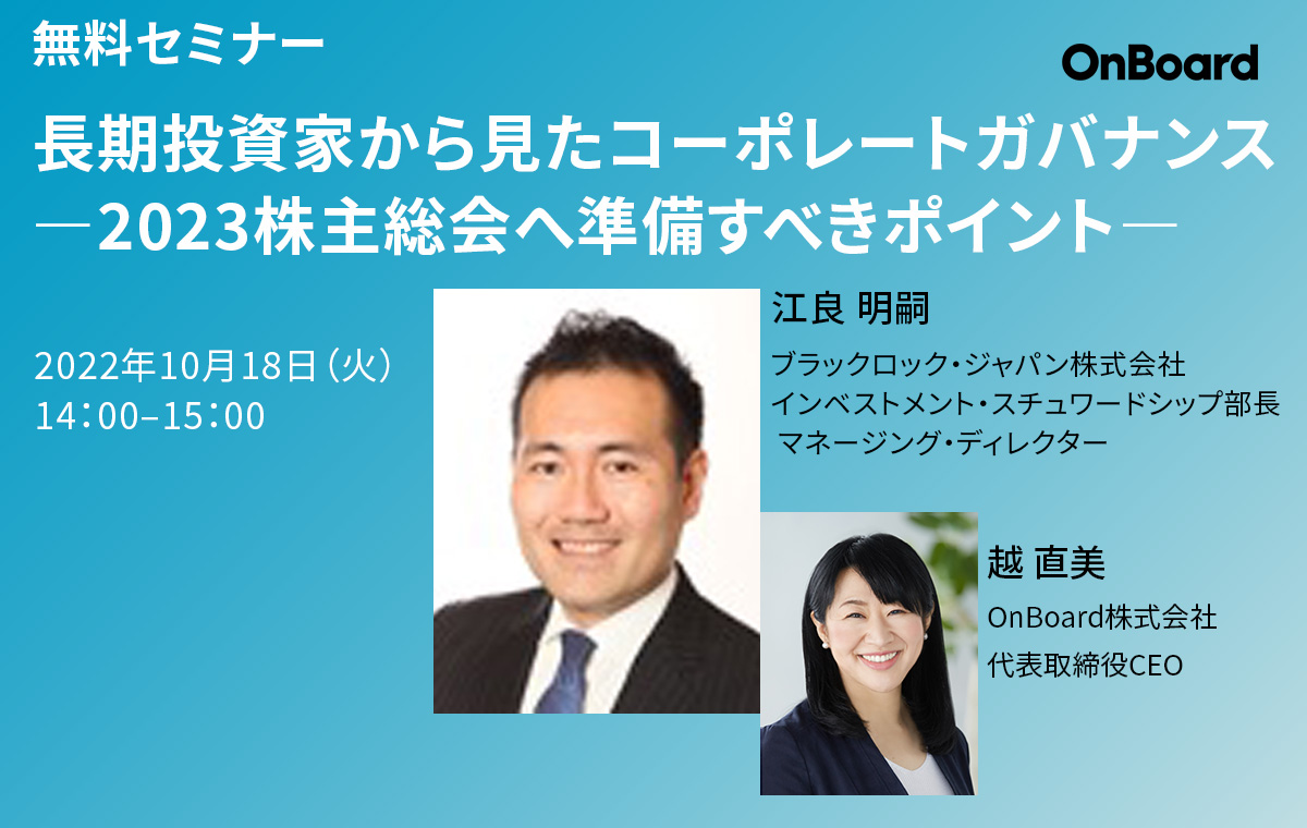 取締役会やコーポレートガバナンスの最新の動向やトピックについて、専門家を招いてお伝えする単発のセミナーです。企業のご担当者の方もぜひご参加ください。
